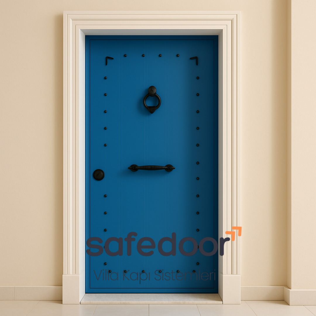 SafeDoor’un A+ serisine özgü üretim anlayışıyla bu modelde de ön ve arka yüzey farklı renklerde üretilebilir. Dış yüzeyde antik mavinin eskitme dokusu korunurken, iç yüzeyde beyaz, gri veya ceviz tonları tercih edilebilir. Kullanıcı talebine göre parmak izli, şifreli, veya akıllı kilit sistemleri entegre edilerek modern güvenlik teknolojileriyle donatılabilir.